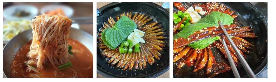 가물치, 붕어, 잉어, 눈치, 칠어, 메기, 빠가사리 등 민물생선과 함께 여러 약재등을 8시간 이상 뼈채 푹고아 삶은 원액에 물과 고추장을 풀어 만든 육수에 소면을 따로 끊여 넣은 정말 진한 생선국수 입니다. 소면은 남겨도 국물은 모두 드셔야 해요 프라이팬에 뺑돌려 고기를 놓고 튀겨 도리뱅뱅 이름처럼 뱅뱅 돌려놓았다고 생긴 이름입니다. 생선하고는 전혀상관없는