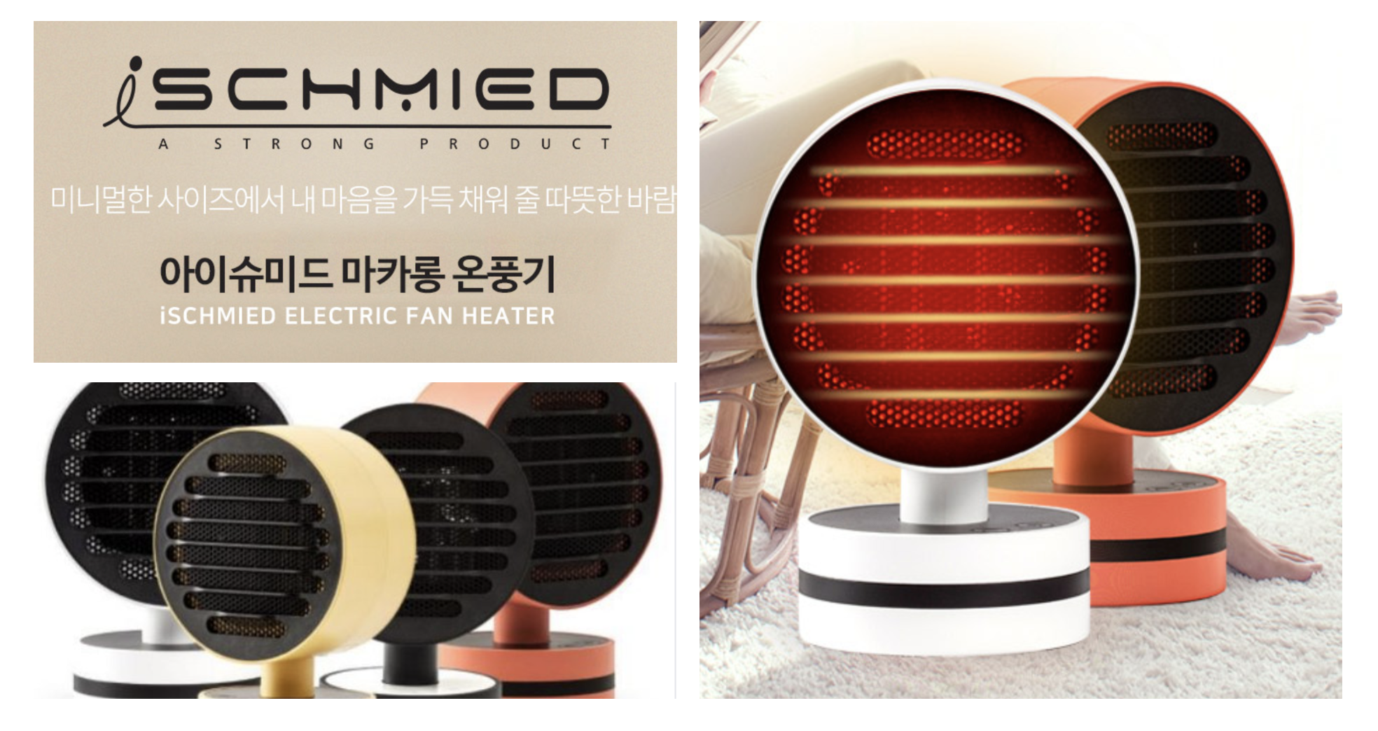 따뜻한 바람이 필요할때는 아이슈미드 마카롱 온풍기를 사용하세요. 가벼운 무기로 언제 어디서든지 강한 열풍으로 빠르고 훈훈한 실내공간을 제공해드립니다. 책상 위, 책상 아래, 침실, 작업공간 어디든 가볍게 휴대하며 필요한 곳에 사용하세요. 강력하고 따뜻한 열풍으로 추운 겨울에도 공간을 따뜻하게 만들어줍니다. 500W의 낮은 전력소모와 파워풀한 열기로 거실, 침실, 공부방 등 어디에 놓아도 작지만 강력한 온풍을 경험할 수 있습니다. 90도 자동 좌우 회전으로 공간 구석구석 골고루 따뜻한 열이 전달됩니다. 또한 항공기 기내 난방시스템 방식으로 PTC 히터를 사용합니다. 산소와 반응하지 않으며, 열선이 없어 불꽃이 튀지 않는 공기순환방식의 스마트한 히터로 과열방지 장치가 장착되어 있어 안전하게 사용할 수 있습니다. 또한 넘어지면 자동 전원 공급 중단으로 내장형 안전전도스위치가 있습니다. 또한 누른지 2초만에 가열을 시작하여 언제추웠는지 모르게 빠르게 따뜻하게 만들어줍니다. 그리고 효율적으로 소음을 제거한 저소음 설계로 작업 공부 수면 휴식을 방해하지 않게 제작되었습니다.
